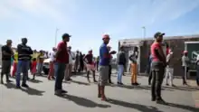 Klanten in de de lijn bij de winkel in de anderhalvemetersamenleving