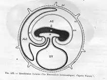 AC. cavité amniotique E. ectoderme de l'embryon M. mésoblaste de l'embryon H. endoderme de l'embryon UV. vésicule ombilicale ALC. cavité allantoïdienne al. allantoïde am. amnios pc. zone pellucide sz. reste de la somatopleure extraembryonnaire constituant le chorion.