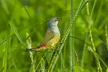 - (Ornithologie) Petit passereau granivore d’Afrique orientale, au ventre ocre jaune, au croupion et à la mandibule inférieure d’un rouge vermillon.
