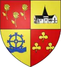 - Écartelé : au 1) de gueules aux trois roses au naturel tigées et feuillées d’une pièce à dextre d'or, au 2) d’or à l’église du lieu soudée d’argent essorée ouverte et ajourée de sable, au 3) d’or à la roue de moulin à eau dans des ondes alésées, le tout d’azur, au 4) de gueules aux trois trèfles d’or mal ordonnés, qui est de la commune de Menneval de l’Eure → voir illustration « roses au naturel d’or »