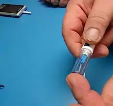 Pour utiliser le glucomètre, il faut faire une petite piqûre au bout d'un doigt à l'aide d'un autre petit appareil, un autopiqueur qui est une sorte de catapulte miniature pour une lancette.