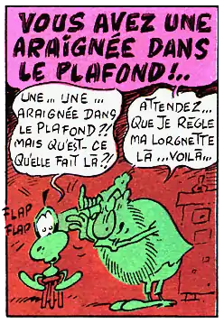 — (Georges Courteline, Le commissaire est bon enfant, 1899)Une araignée ? Est-ce que vous n’en avez pas une dans le plafond ?