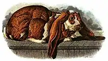 - Race de lapins, originaires d’Angleterre, de taille moyenne, au chanfrein busqué et aux oreilles tombantes particulièrement longues.