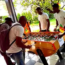 - (Faux anglicisme) Jeu de simulation de football (au sens européen), joué de part et d’autre d’une table creuse, où les joueurs tentent de marquer des buts avec une petite balle en actionnant des joueurs miniatures montés sur des barres mobiles.