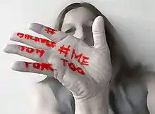 - (2017) → voir balance, ton et porc. La locution est inventée par Sandra Muller[1]. Balance est l’impératif du verbe balancer signifiant au sens argotique « dénoncer », et porc est au sens d’« homme ne pouvant réprimer ses instincts sexuels ». D’abord mot-clé sur les réseaux sociaux, le mot s’est étendu hors Internet, sur les pancartes, graffs et banderoles.