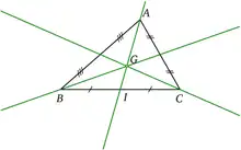 - (Mathématiques) (Géométrie analytique) Point d’intersection des trois médianes d’un triangle.