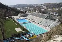 Podolí : celkový pohled na venkovní bazény s tribunou