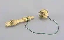 - (Jeux) Sorte de jouet de bois ou d’ivoire, formé d’un petit bâton, dont un bout est pointu et l’autre terminé par une espèce de petite coupe, et auquel est suspendue, par une cordelette, une boule percée d’un trou ; on met cette boule en mouvement de manière qu’elle retombe et reste dans la coupe, ou que le bout pointu pénètre dans le trou de la boule et la fixe lorsque celle-ci retombe.