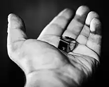 — (Yann ar Flocʼh, Koñchennou eus Bro ar Ster Aon, Kemper, 1950, page 85)- Il met la bague dans sa main et appelle sa femme.