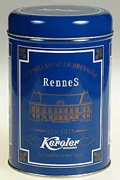 - Boîte en métal conçue pour y conserver des biscuits.