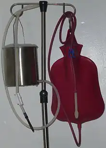 - Appareil destiné à effectuer des lavements intestinaux ou vaginaux. Il est constitué d’un réservoir qui s’accroche en hauteur, au bas duquel est fixé un tuyau puis une canule interchangeable. La pression nécessaire à l’introduction du liquide est fournie par le dénivelé entre le réservoir et la personne recevant le lavement.