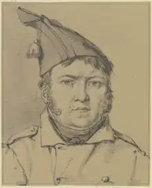 Il porte un bonnet de police.