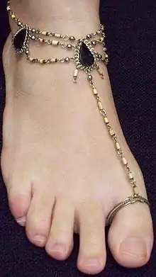 Un bracelet de cheville reliée à une bague d’orteil.