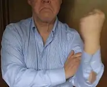 - Geste marquant la réprobation, de manière impolie et obscène. Il consiste à se taper d’une main le creux du coude du bras opposé, plié en dressant l’avant-bras, face à son interlocuteur (avec le poing serré ou en faisant un doigt d’honneur).