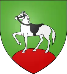- De sinople au cheval d’argent bridé et sellé de sable passant sur une terrasse de gueules, qui est de Hénin-Beaumont → voir illustration « cheval bridé »