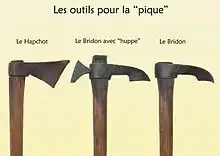 - (Exploitation forestière) Sorte de hachot à fer recourbé avec lequel, dans les Landes, on fait une ouverture aux pins pour en extraire la résine.