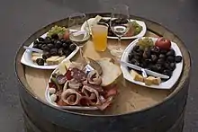 Une brisolée : châtaignes rôties accompagnées de fromage, fruits, lard, viande séchée, moût et vin blanc.