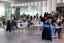 - Grand local d'un établissement d'enseignement ou autre où l'on peut manger son propre lunch ou des repas servis sur place à un comptoir.