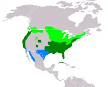 Répartition géographique du canard carolin : Vert foncé - habitat permanent / Vert clair - nidification / Bleu - zone d'hivernage.
