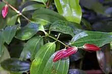 Une branche de cannelier de Ceylan avec des jeunes feuilles rouges.