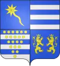 - écartelé : au I, d’azur à la comète d’or posée en bande ; au II et III, fascé d’azur et d’argent ; le fascé du troisième quartier chargé de 21 besants d’or, rangés 6, 5, 4, 3, 2, 1 cousus sur les fasces d’argent ; au IV, d’azur à deux lions couronnés d’or, rampant et affrontés.