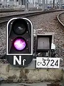 - (Chemin de fer) (France) Signal de voie de service, commandant l’arrêt et ne pouvant être franchi, même s’il a été éteint après l’arrêt.