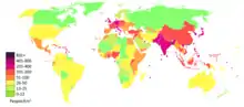Cartogramme (1) par couleur illustrant la densité de population par pays dans le monde.
