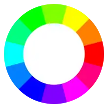 - Représentation circulaire des couleurs conventionnelle où les couleurs pures changent continuellement (rouge, jaune, vert, bleu, pourpre) et où les couleurs complémentaires s’opposent diamétralement sur le cercle. Correspond aux limites des couleurs sur un diagramme de chromaticité moderne.