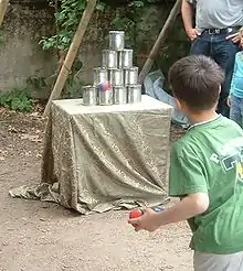 - Jeu d’adresse consistant à faire tomber des boites empilées avec une balle.