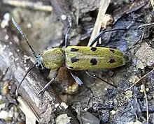 - (Entomologie) Espèce de coléoptère européen dont la larve est xylophage, et dont le corps est couvert de poils verdâtres, sauf sur quelques ronds noirs.
