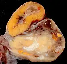 - (Anatomie) Le corps jaune (corpus luteum) est une formation temporaire, à l’intérieur de l’ovaire, qui résulte de la transformation du follicule de De Graaf (follicule mûr ou encore déhiscent) après expulsion de l’ovocyte lors de l’ovulation.