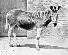 - (Zoologie) Sous-espèce (Equus quagga quagga Boddaert, 1785) éteinte du genre cheval originaire d’Afrique, à raies gris roussâtre en travers de la tête, crinière courte et droite. Le couagga fut d’abord considéré comme une espèce distincte du zèbre à cause de sa robe sans rayures à l’arrière. Ce n’est que beaucoup plus tard qu’on en fit une sous-espèce du zèbre de Burchell.