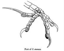 Pied zygodactyle du grand coucal (Centropus sinensis) montrant le hallux et sa griffe remarquablement allongée, typique des coucals.