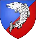 - Taillé d’azur et de gueules, au saumon d’argent courbé brochant sur la partition, qui est de Geiswasser → voir « saumon courbé »
