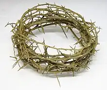 - (Religion) Couronne composée de branches d’un arbre à épines entrelacées ou liées ensembles. Il s’agit d’un des symboles de la crucifixion du Christ. Elle est employée comme symbole religieux ou de souffrance.