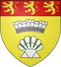 - D’or à la coquille renversée d’argent, les cotes de sinople, surmontée d’une couronne murale de trois tours d’argent, maçonnée de sable ; au chef de gueules chargé de trois lions d’or, qui est de la commune de La Coquille de Dordogne → voir illustration « armoiries avec une couronne murale »