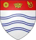 - D’argent à trois jumelles ondées d’azur, au chef de gueules chargé d’une couronne navale accostée d’une roue d’engrenage et d’une roue ailée d’or, qui est de la commune de Barrie d’Ontario au Canada → voir illustration « armoiries avec une couronne navale »