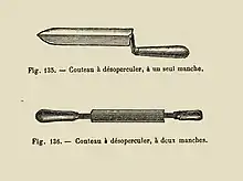 Les couteaux à désoperculer sont de divers modèles : les uns, ([…]), à deux mains, ont la forme d'une plane de charpentier à lame convexe ou biseautée sur la face qui touchera le rayon ; les autres manœuvrés d'une seule main ([…]) ont également la lame biseautée en dessous pour ne pas entamer le rayon trop profondément.