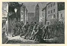 Une patrouille du couvre-feu arrête des noctambules, dans une ville occupée à onze heures le soir, durant la guerre franco-prussienne.