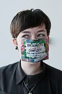 Une craftiviste portant un masque qu’elle a réalisé elle-même, avec une inscription militante.