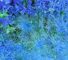 - Mot inventé par le minéralogiste allemand Ernst Friedrich Glocker en 1839. Il l'a nommé à partir du grec kyanos (bleu) et thriks (chevelure) soit "chevelure bleue", habitus le plus commun pour ce minéral.