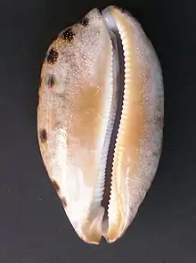- Cypraea annulus (cotique blanc, porcelaine anneau d'or, cyprée anneau)