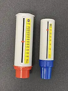 - (Médecine) Appareil médical simple et portatif utilisable par le patient lui-même. Il est destiné à donner une indication du débit expiratoire de pointe, c'est-à-dire le nombre de litres d'air par seconde que le sujet peut expirer au moment où son souffle est le plus puissant, où l'air sort le plus rapidement.