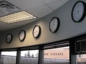 Horloges permettant de visualiser rapidement le décalage horaire entre différents centres d'opérations multinationaux.