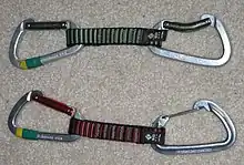 - (Alpinisme) Appareil de deux mousquetons reliés par une sangle.