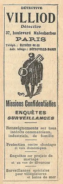 Réclame de 1921 pour l’agence de détectives Villiod.