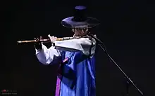 - (Musique) Grande flûte traversière en bambou possédant une membrane bourdonnante d’origine coréenne.
