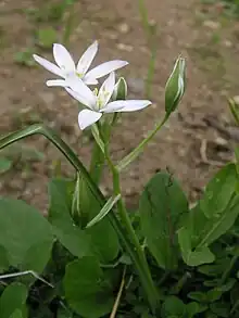 - (Botanique) Nom vulgaire de l’ornithogale en ombelle (Ornithogalum umbellatum) ou ornithogale à feuilles étroites (Ornithogalum angustifolium), plante herbacée vivace de la famille des liliacées (comme le muguet ou le lis martagon), parfois aussi appelée belle-d’onze-heures, étoile de Bethléem ou jacinthe du Pérou.