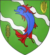 - De sinople à deux cotices ondées d’argent, accompagnées en chef d’un épi de maïs d’or et en pointe d’un épi de blé du même, au dauphin d’azur barbé, crêté, lorré, peautré et oreillé de gueules, brochant sur le tout, qui est de Sardieu → voir illustration « armoiries avec un dauphin »