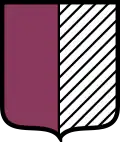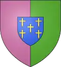 - Parti de pourpre et de sinople ; à l’écusson brochant d’azur, aux cinq croisettes latines au pied fiché d’or, qui est de Saint-Ouen-Marchefroy → voir illustration « parti de pourpre et de sinople »